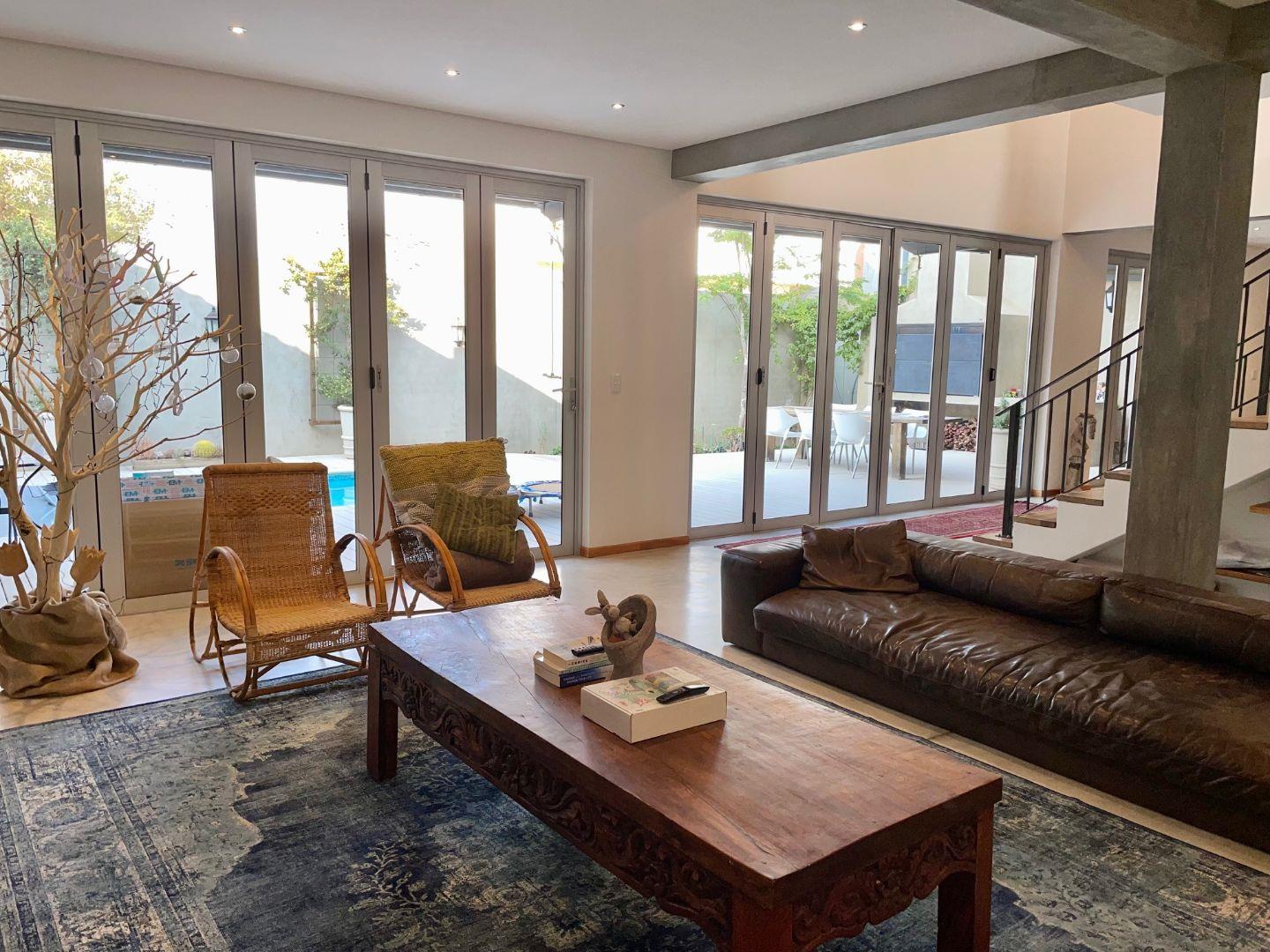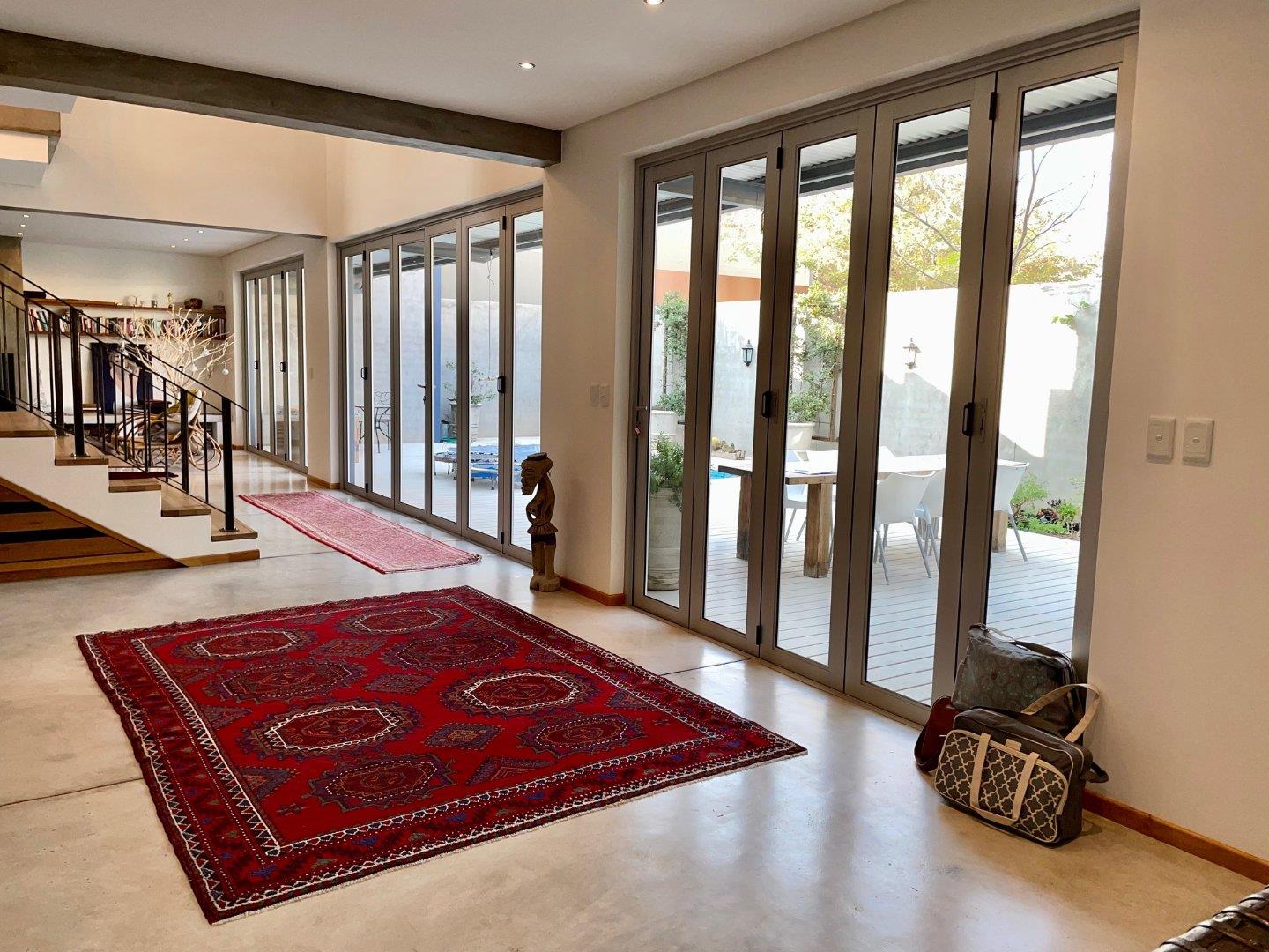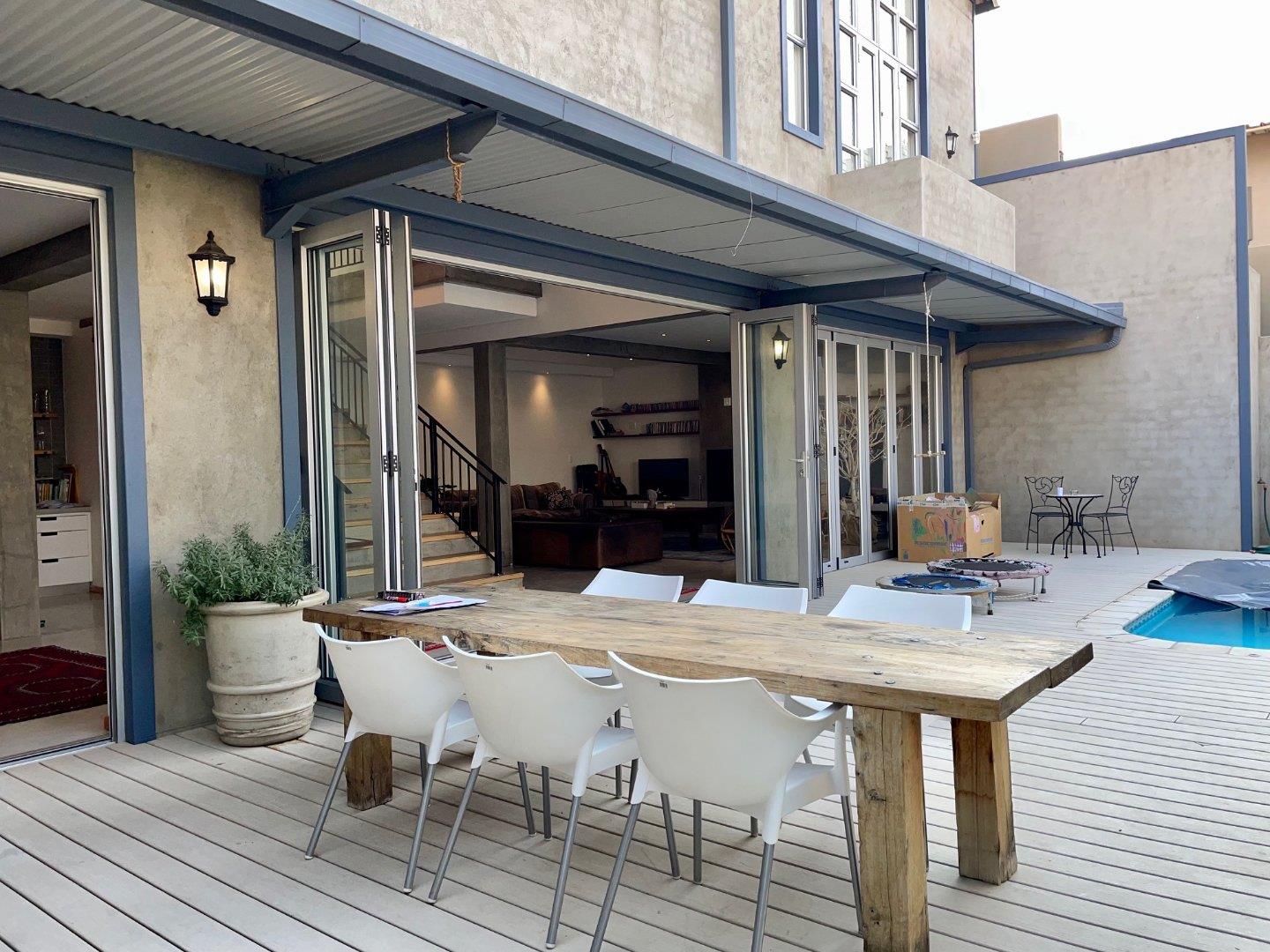 On the ground floor, an open plan lounge with a fire place, dining room and modern kitchen with a gas stove, all opening with stackable doors to the entertainment area, sparkling pool, BBQ and garden.